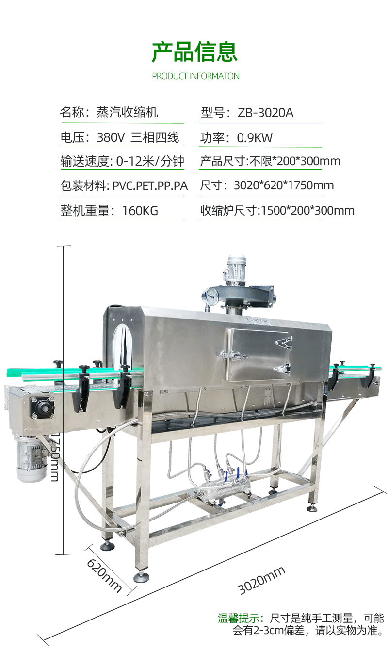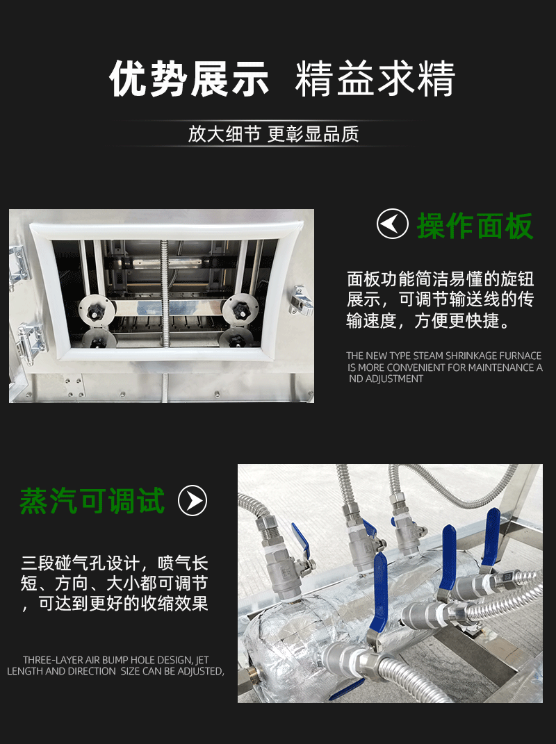 - 收縮通道清潔:收縮通道內的蒸汽噴頭和通風口需要定期清理。蒸汽噴頭堵塞會影響蒸汽的均勻分布,導致收縮效果不佳??梢允褂密浢⒒驂嚎s空氣來清理噴頭,去除可能堵塞噴頭的雜質。通風口堵塞會影響空氣流通,不利于包裝材料的冷卻定型,因此也要定期檢查和清理通風口。