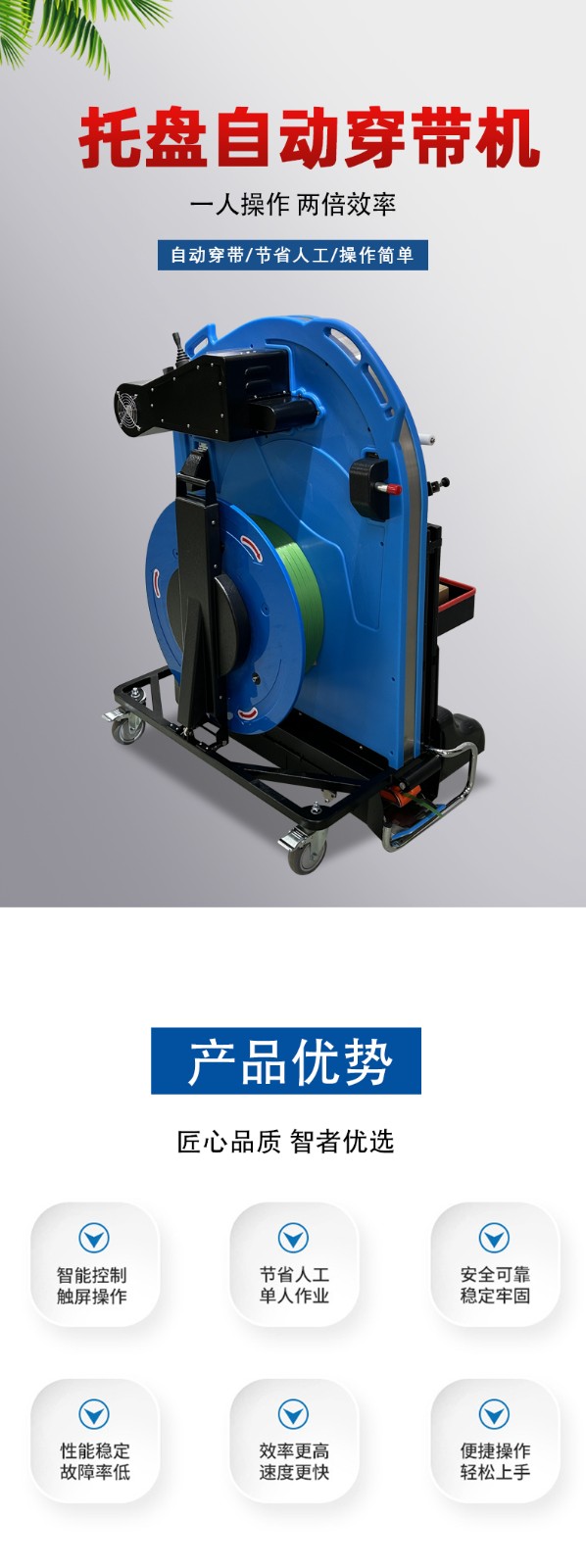 - 在包裝流程中主要起輔助作用。它是為打包機的工作做鋪墊,將打包帶準確地放置在合適的位置,方便打包機進行后續(xù)操作。如果把包裝過程比作一場接力賽,穿帶機就像是第一棒,為后續(xù)打包機的工作創(chuàng)造良好的條件。