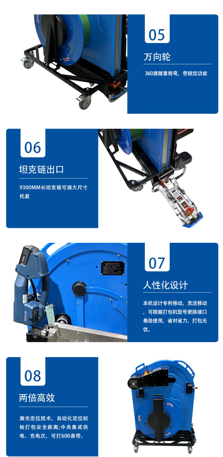 - 主要功能是完成打包操作。這包括拉緊打包帶,通過機械或液壓裝置對打包帶施加足夠的拉力,使打包帶緊緊地纏繞在貨物上。例如,在使用鋼帶打包機時,其拉力可以達到很高的強度,能夠牢固地固定重型貨物。