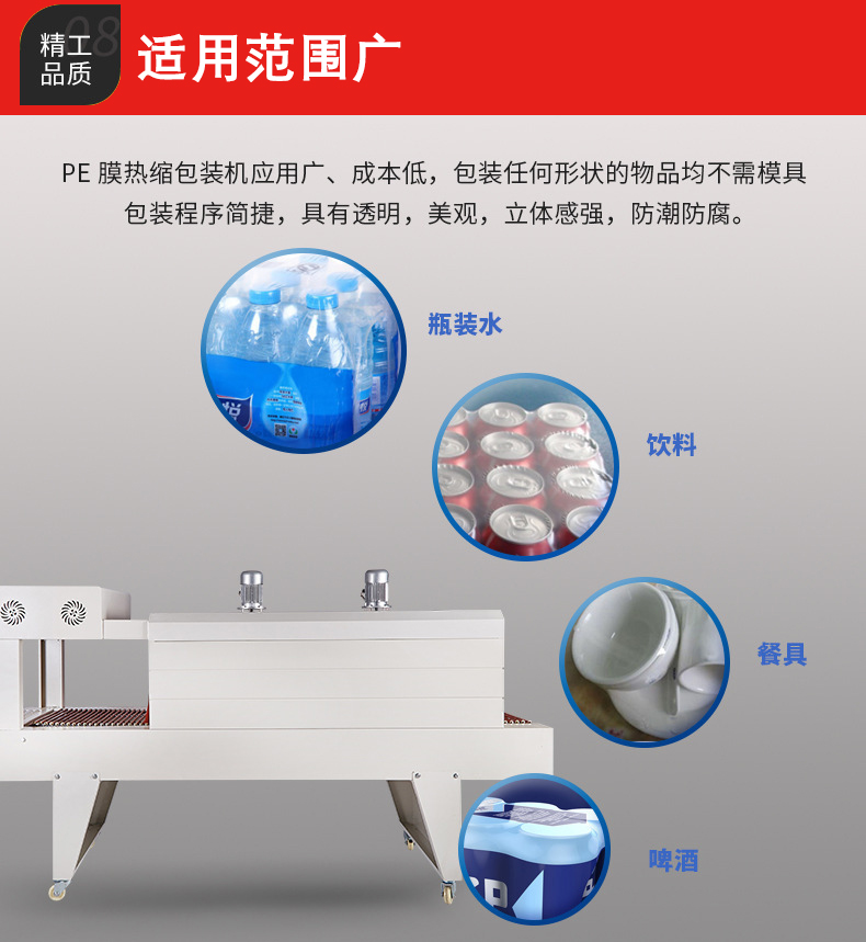 - 適用于中型規(guī)模的包裝生產線。其優(yōu)勢在于加熱均勻、穩(wěn)定,使用壽命長。在一些中型的食品、日用品生產企業(yè)中,不銹鋼加熱系統(tǒng)的 PE 熱收縮機能夠提供高質量的包裝效果,滿足一定批量產品的包裝需求。