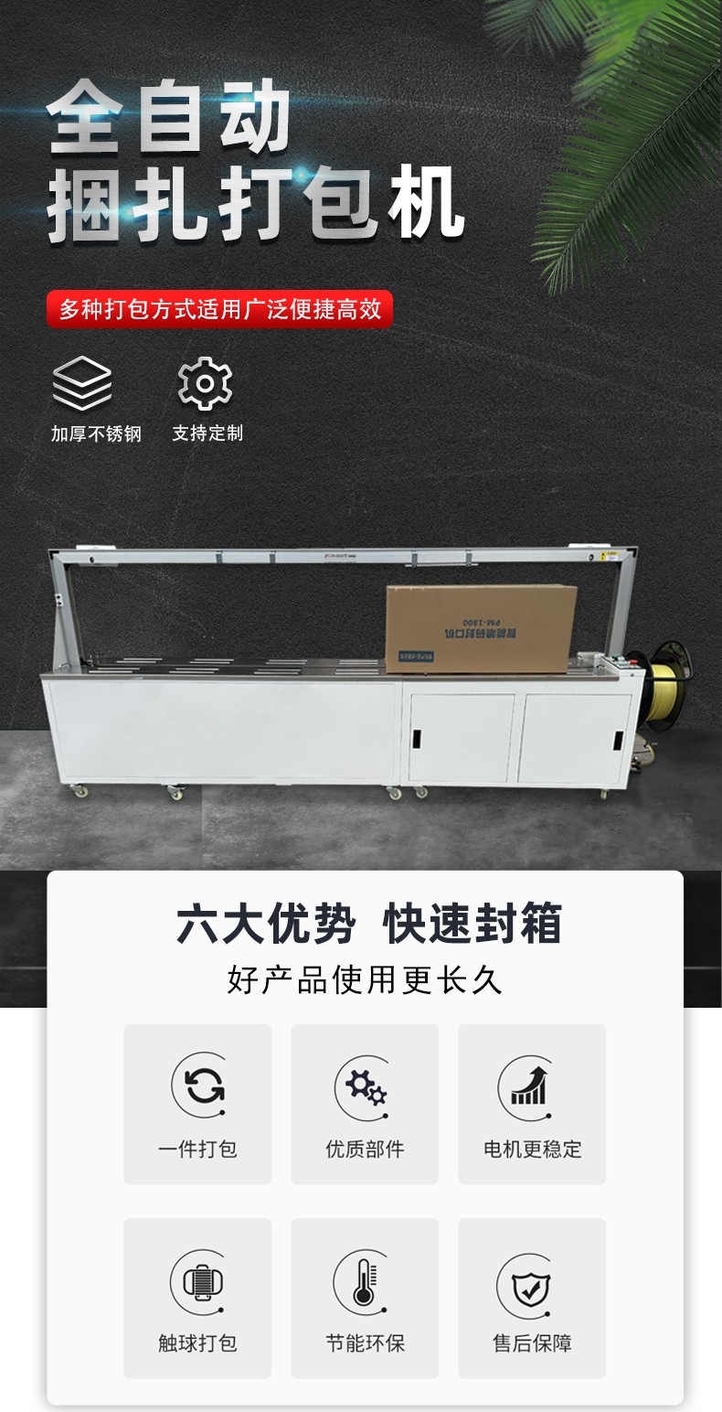 - 高效快速:全自動打包機的打包速度堪稱行業(yè)翹楚,部分高性能機型每分鐘可輕松完成 15 - 25 次打包操作 。以物流倉儲行業(yè)為例,在大型物流中心,每天有成千上萬件包裹需要打包處理。傳統(tǒng)人工打包方式不僅效率低下,還容易因疲勞導(dǎo)致打包質(zhì)量參差不齊。而全自動打包機投入使用后,包裹在傳送帶上源源不斷地被輸送至打包區(qū)域,設(shè)備以極高的速度自動完成送帶、環(huán)繞、加熱封口等一系列動作。每小時能處理數(shù)百件包裹,使得物流中心的包裹打包效率大幅提升,有效緩解了貨物積壓問題,加快了貨物的流轉(zhuǎn)速度 。