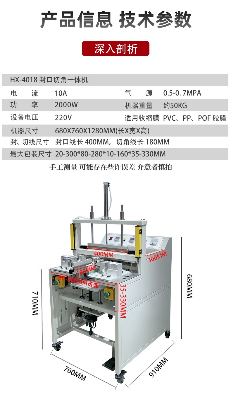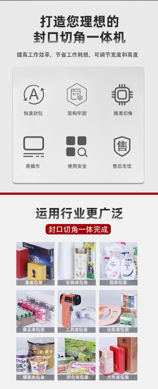 高效快捷:封口速度比傳統(tǒng)設(shè)備快,部分機型每分鐘可完成 50 次精準(zhǔn)封口,能有效提高生產(chǎn)效率。 操作簡便:通常采用一鍵啟動或腳踏開關(guān)控制,操作人員只需簡單培訓(xùn)即可上手操作。 封口質(zhì)量好:采用雙面加熱封口,壓合平整美觀,封口牢固,且封口長度、寬度等參數(shù)可根據(jù)需求調(diào)整。 適應(yīng)性強:可適用于 PVC、PP、POF 等多種材質(zhì)的收縮膜,還能根據(jù)不同產(chǎn)品規(guī)格進行調(diào)整,兼容多種尺寸的包裝材料。 安全性高:部分機型配備急停按鈕等安全裝置,且外觀設(shè)計圓潤,無棱角,可減少操作人員受傷的風(fēng)險。 應(yīng)用場景 廣泛應(yīng)用于食品、化工、電子、醫(yī)藥、日化等行業(yè),可用于對各種產(chǎn)品的包裝材料進行封口和切角處理,如食品包裝袋、日化用品包裝袋、電子產(chǎn)品包裝盒等的封裝。 代表產(chǎn)品 如中堡智能科技實業(yè)有限公司的HX-4018 智能氣動封口切角機、東莞博冠包裝實業(yè)有限公司的氣動封口切角機等,均具有運行穩(wěn)定、包裝速度快、多規(guī)格適配等特點。