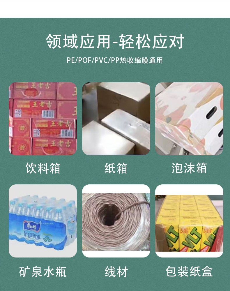 產(chǎn)品經(jīng)輸送帶進入設(shè)備后,薄膜被自動套在產(chǎn)品外部,通過電熱絲高溫封切形成袖口狀包裝,隨后進入熱收縮通道,利用高溫使薄膜均勻收縮,緊貼產(chǎn)品表面,完成 “套膜 - 封切 - 熱收縮” 三步包裝流程。