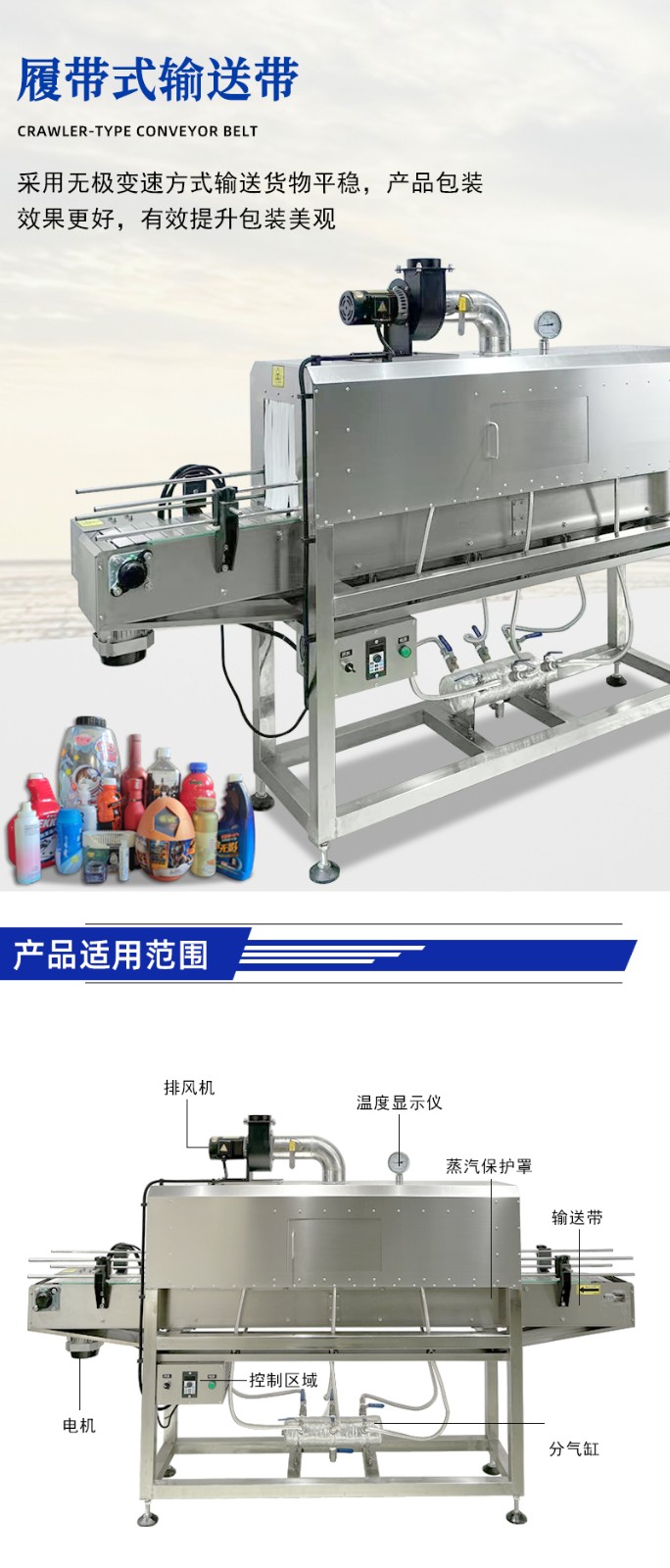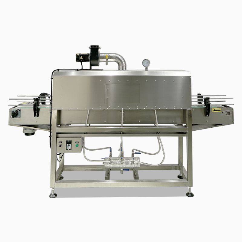 - 帶有封閉薄膜的產(chǎn)品被輸送帶送入蒸汽收縮通道。