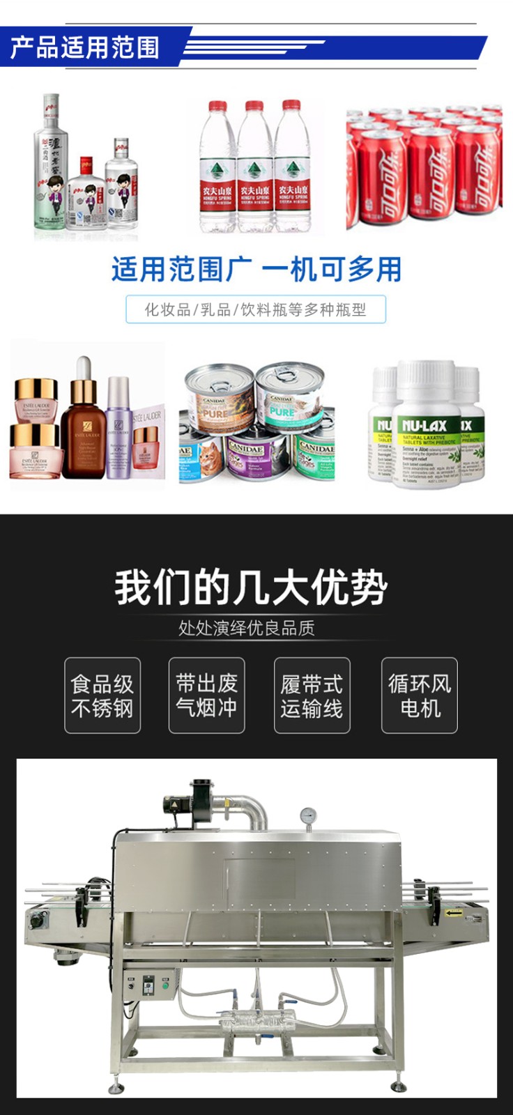 - 完成收縮的產(chǎn)品繼續(xù)在通道內(nèi)移動,通道末端的通風(fēng)裝置會排出多余蒸汽,并對產(chǎn)品進行快速冷卻。
