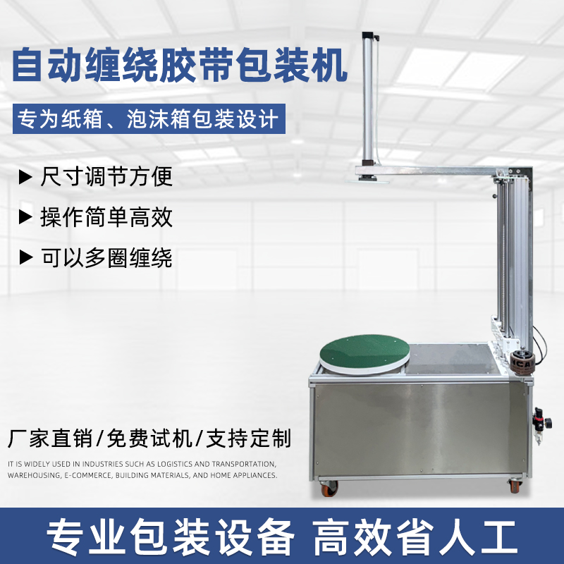 - 貨物纏繞機:主要用于托盤貨物、大型設備等的包裝,通過旋轉(zhuǎn)工作臺帶動貨物旋轉(zhuǎn),同時膠帶從上方或側面進行纏繞,如常見的物流倉儲用膠帶纏繞機。