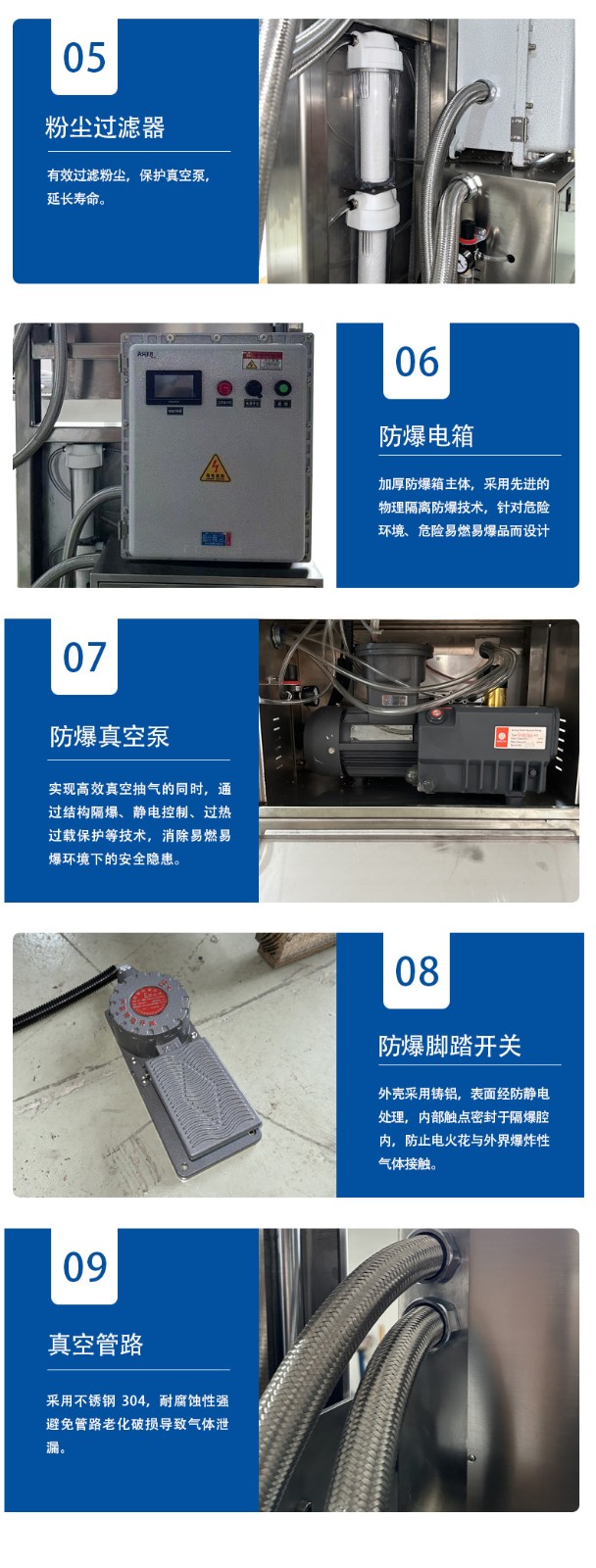 - 密封與過濾部件:機頭柜和電柜均采用全密封設(shè)計并加裝密封膠條,防止易燃易爆氣體、粉塵進入內(nèi)部損壞元件或引發(fā)短路;關(guān)鍵的抽氣口、真空室等采用 304 不銹鋼材質(zhì),部分機型還配有 40mm 厚的有機玻璃透明觀察窗,既保障防爆性能又便于觀察包裝過程;同時加裝粉末隔離和過濾裝置,防止包裝物料中的粉塵堵塞真空泵,避免設(shè)備故障導(dǎo)致的安全問題。