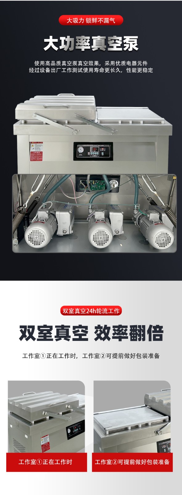 - 交替作業(yè),效率提升 50% 以上雙室機(jī)型的兩個(gè)真空室可實(shí)現(xiàn) “一工一備”:當(dāng)其中一個(gè)真空室正在進(jìn)行抽真空、熱封作業(yè)時(shí),操作人員可以在另一個(gè)真空室完成物料擺放、袋口整理的準(zhǔn)備工作。單室機(jī)型則必須等抽真空 - 熱封 - 開蓋取件整個(gè)流程結(jié)束后,才能進(jìn)行下一批物料的擺放,存在明顯的操作等待空窗期。同等規(guī)格下,雙室機(jī)的單位時(shí)間包裝量是單室機(jī)的 1.5-2 倍,尤其適合中小型加工廠的連續(xù)批量生產(chǎn)。