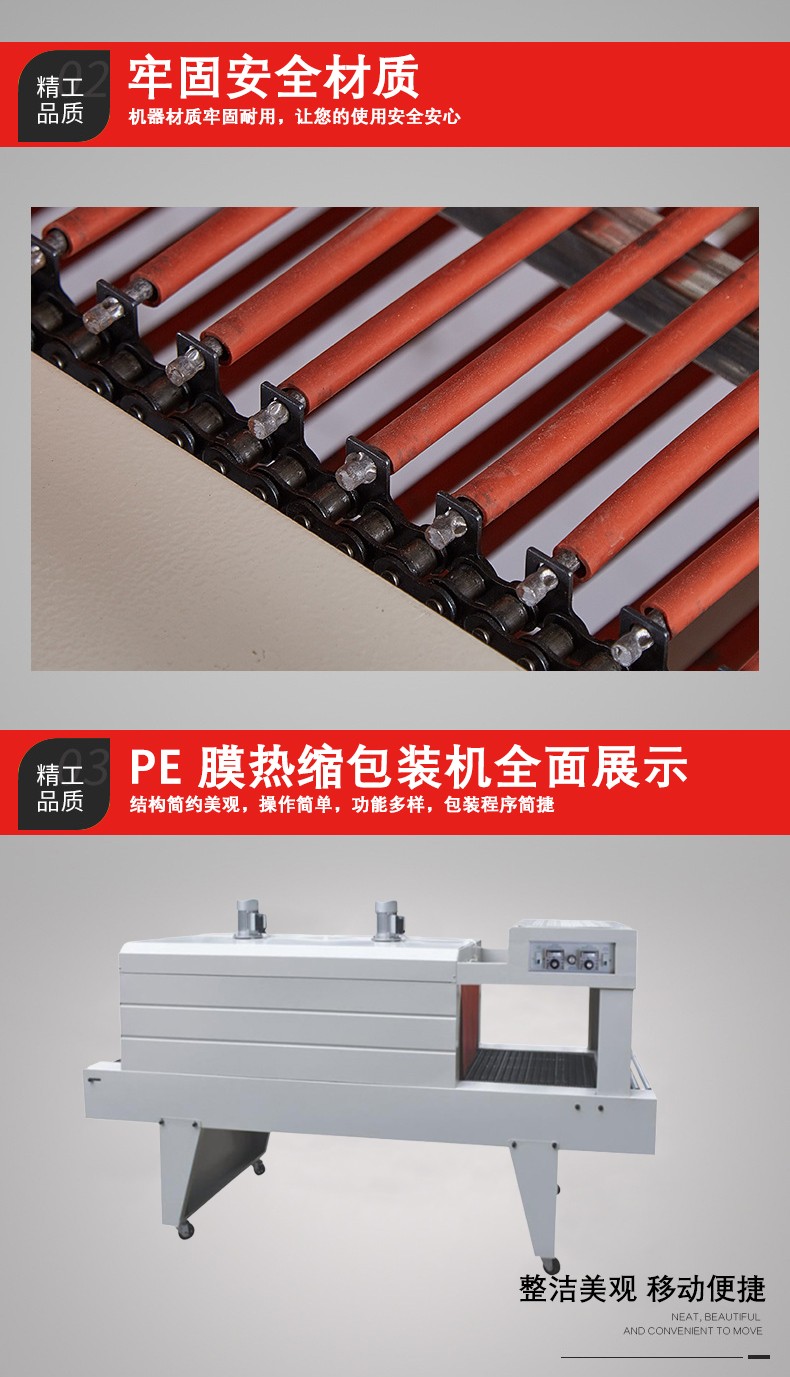 - 適用范圍廣:可以用于包裝各種形狀和尺寸的產(chǎn)品,無論是規(guī)則的圓柱體、長方體,還是不規(guī)則的產(chǎn)品,只要選擇合適的 PE 薄膜,都可以用這種機(jī)器進(jìn)行包裝。而且它可以與其他包裝設(shè)備和生產(chǎn)線集成,實現(xiàn)自動化包裝,提高生產(chǎn)效率。