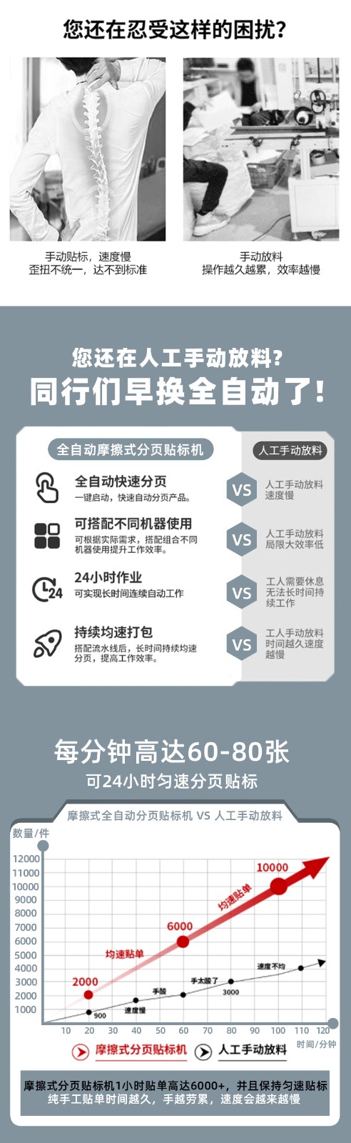 - 高速貼標:全自動分頁貼標機采用先進的機械結構和控制系統(tǒng),具備極高的貼標速度。一般來說,其貼標速度可達每分鐘 100-300 張甚至更高,具體速度取決于設備的型號和配置。相比之下,人工貼標速度慢,且難以長時間保持穩(wěn)定的高效率,全自動分頁貼標機可以持續(xù)穩(wěn)定地高速運行,大大縮短了產品的貼標時間,提高了整體生產效率。