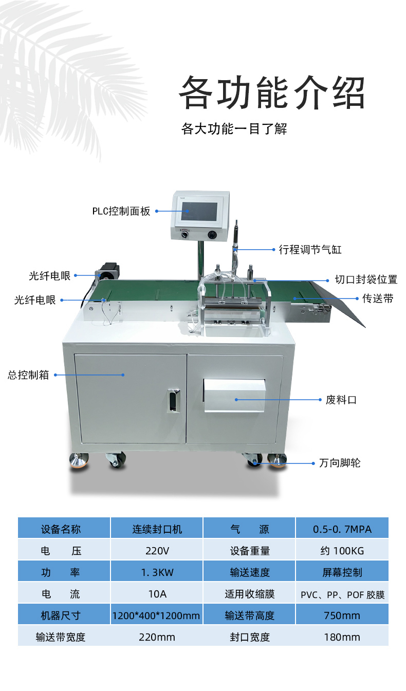 - 連續(xù)式氣動封切機整體結(jié)構(gòu)較為緊湊,通常由機身框架、封切機構(gòu)、輸送機構(gòu)、控制系統(tǒng)操作面板以及防護裝置等部分組成。機身框架采用堅固的金屬材料制成,能夠穩(wěn)定支撐各部件并承受一定的工作負荷。封切機構(gòu)位于機器的上方或特定工作區(qū)域,包含氣動缸、封切刀等關(guān)鍵部件,氣動缸通過連接部件與封切刀相連,以提供動力實現(xiàn)封切動作。輸送機構(gòu)貫穿機器,由輸送帶、驅(qū)動滾筒、電機等組成,輸送帶一般采用耐磨、耐高溫的材料制成,可根據(jù)不同的包裝需求選擇合適的寬度和長度??刂葡到y(tǒng)操作面板通常安裝在機器的側(cè)面或便于操作的位置,上面設(shè)有各種按鈕、旋鈕和顯示屏,用于設(shè)置封切參數(shù)、控制機器運行狀態(tài)等。防護裝置則安裝在機器的危險區(qū)域周圍,如封切刀附近,以防止操作人員意外接觸到運動部件或高溫部件,保障人員安全。