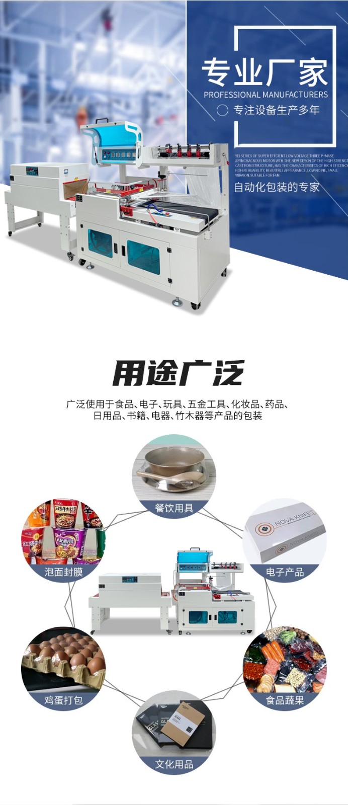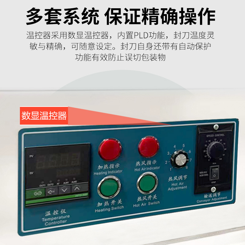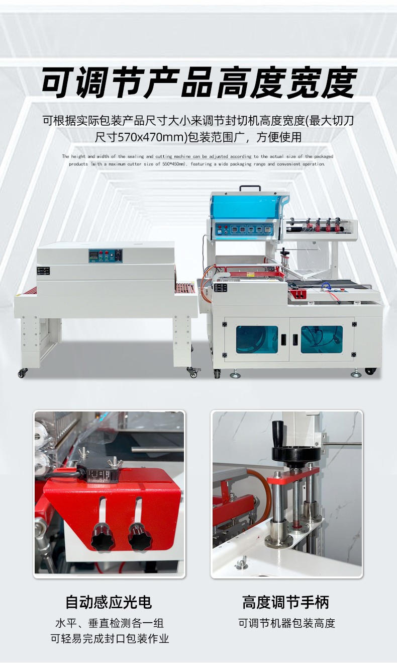 - 設(shè)備可通過調(diào)節(jié) “輸送帶速度、封切溫度、收縮溫度”,適配不同尺寸產(chǎn)品(通常適用產(chǎn)品尺寸:長 50-600mm、寬 30-400mm、高 20-300mm),從小件(如口紅、藥盒)到中件(如禮盒、小家電)均可包裝。