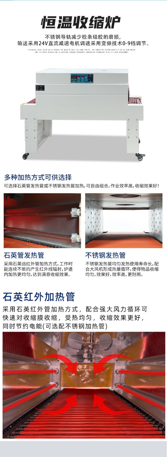 - 收縮爐采用 “不銹鋼保溫爐體 + 熱風(fēng)循環(huán)設(shè)計”,熱量流失少,比傳統(tǒng)開放式加熱節(jié)能 20%-30%;