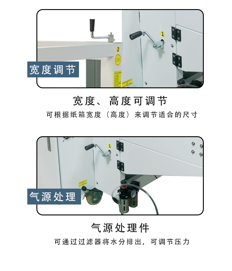 - 在開箱位置,機器通過一系列機械動作來撐開紙箱。首先,會有機械裝置將紙箱的兩個相對側(cè)面撐開,這可能是通過氣缸的伸縮運動來實現(xiàn)的。例如,氣缸的活塞桿伸出,推動紙箱側(cè)面的折頁,使紙箱側(cè)面逐漸展開。然后,另外兩個相對的側(cè)面也會以類似的方式被撐開。